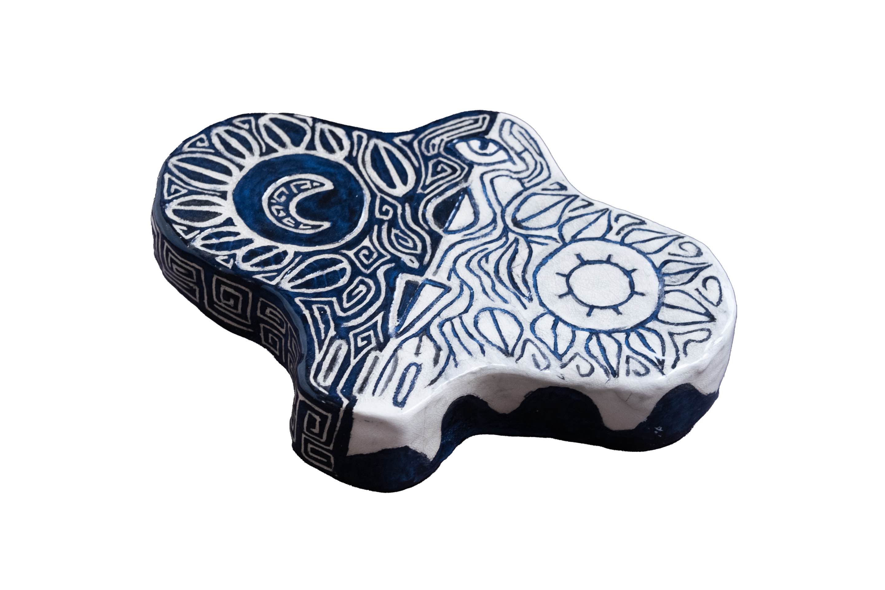 This is a ceramic project made with an Aztec inspired pattern carved into it, creating an illustration representing the contrast between night and day.