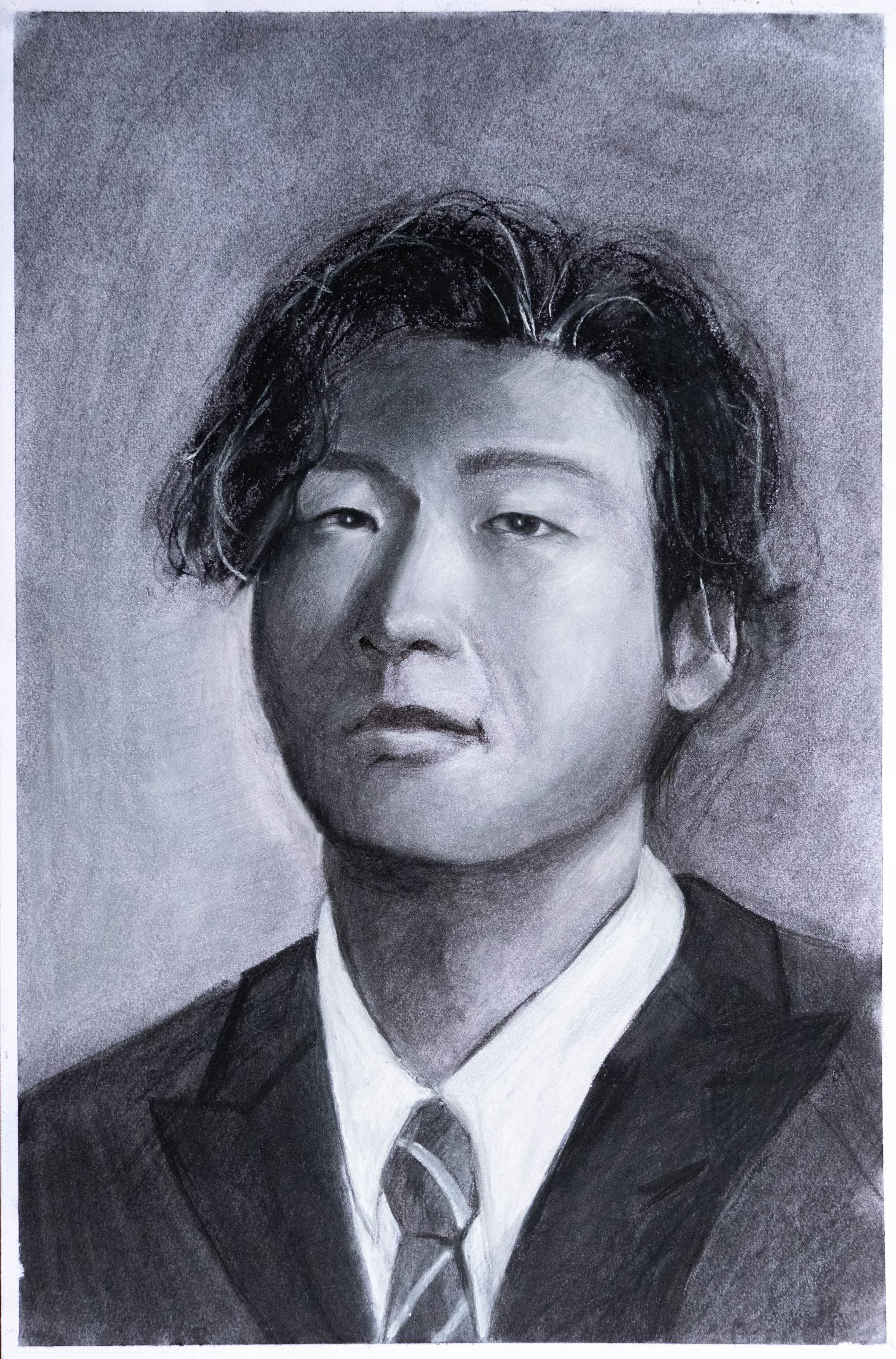 A standard portrait created using black and white charcoal.