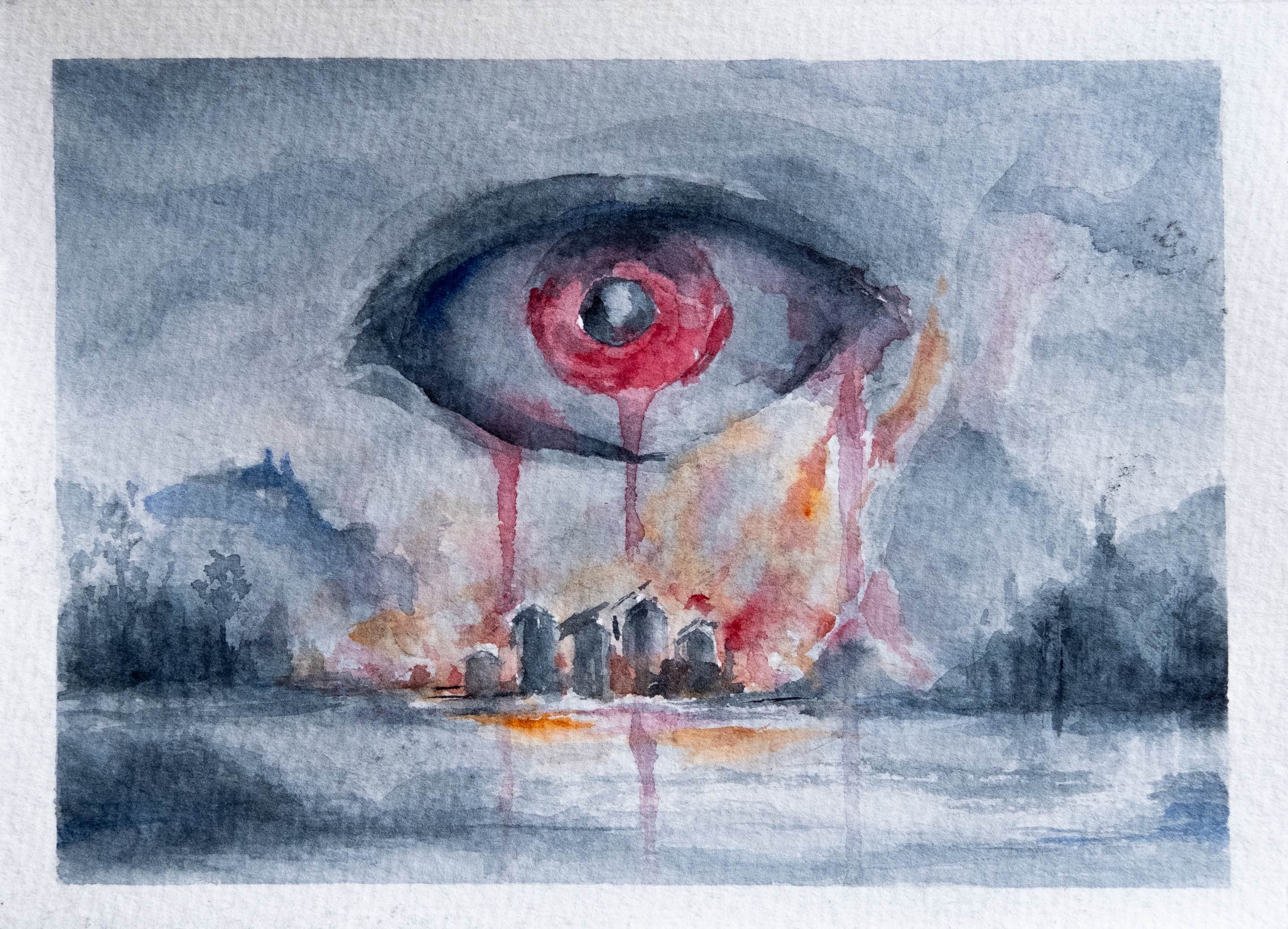 Small watercolor painting that depicts a bloody eye above a cold landscape