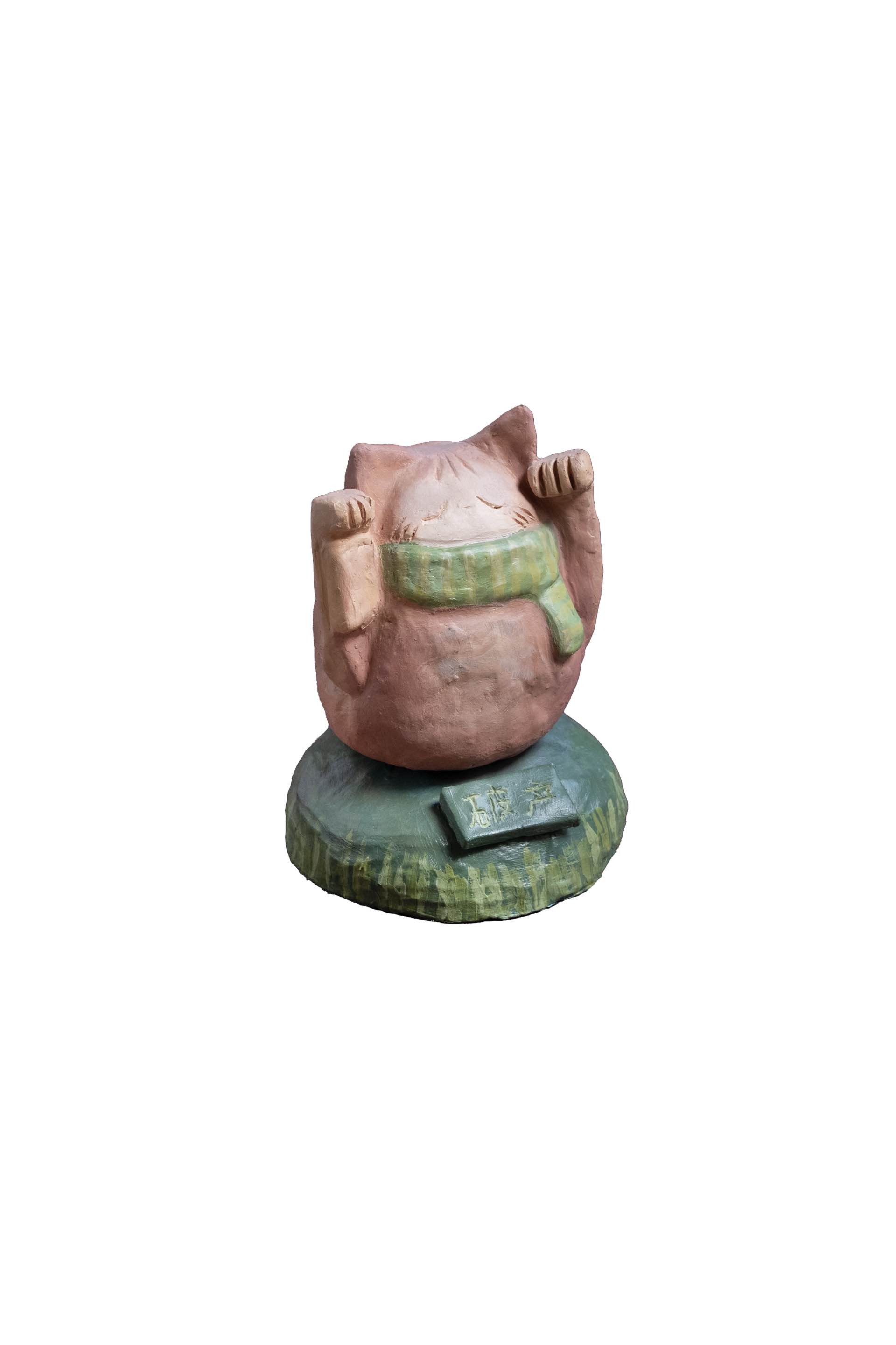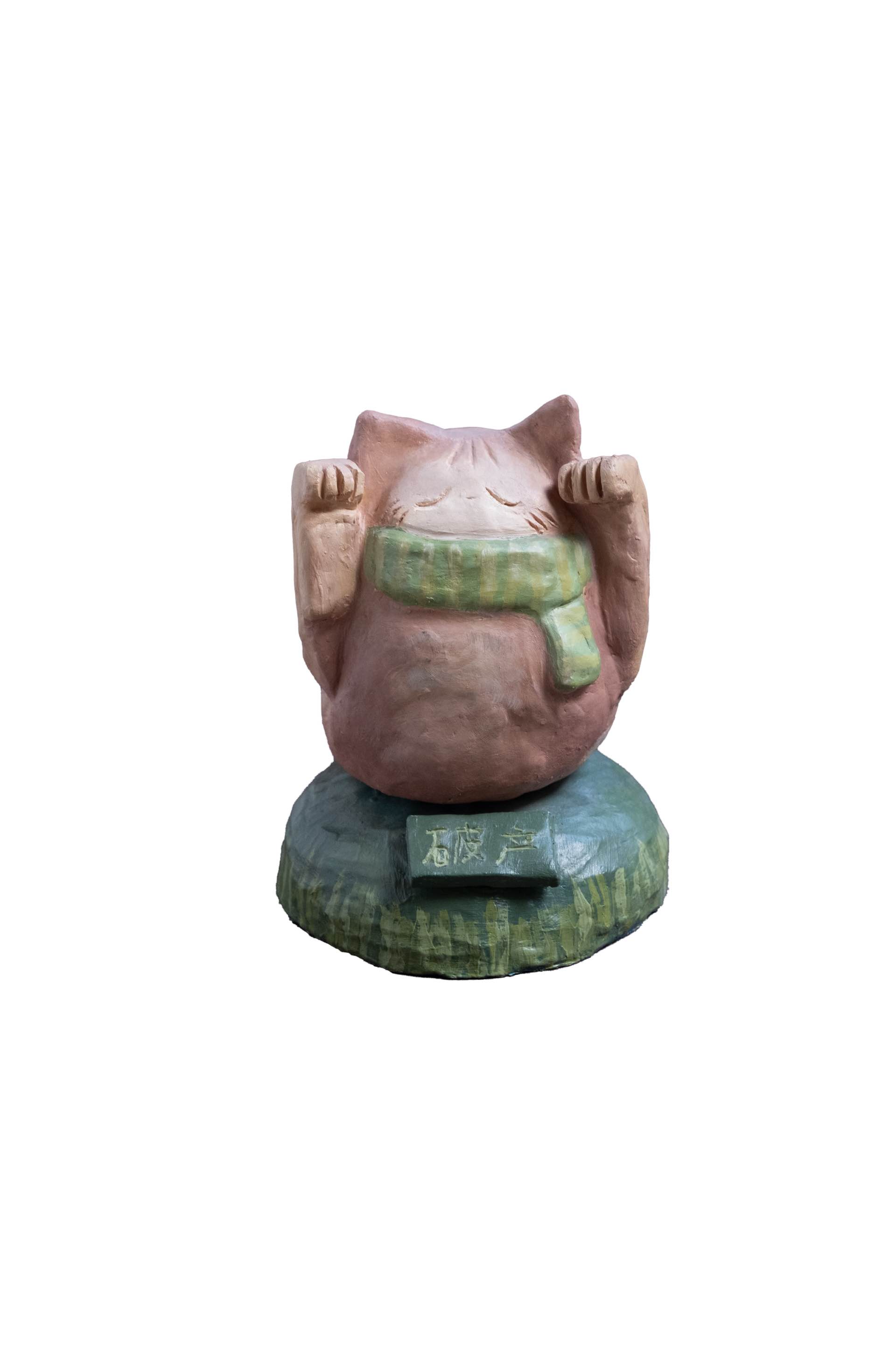 Ceramic cat sculpture, painted with acrylic. This was made to contrast the "Lucky cat" statues often seen in asian restaurants. The sign on the base says, "bankruptcy" in contrast to it usually representing wealth and fortune.
