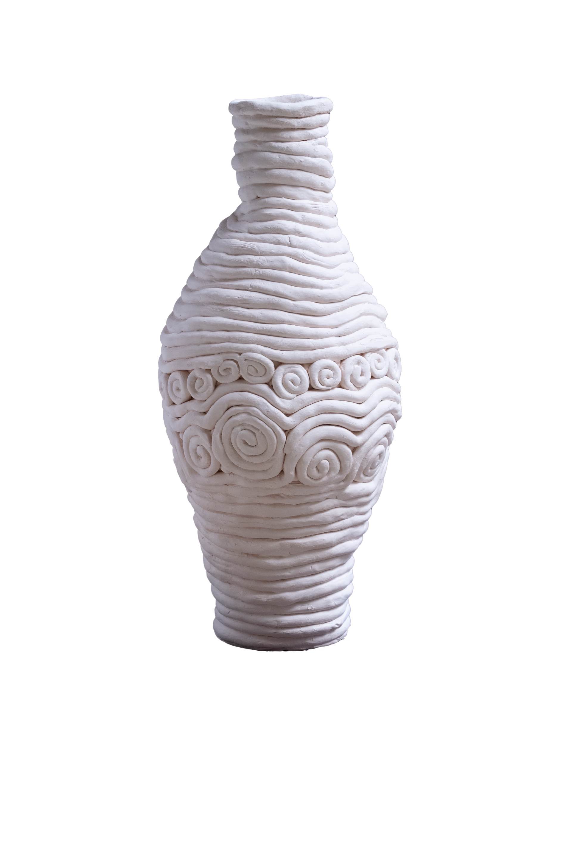 Clay vase made using a layering technique, with occasional patterns embedded into it.