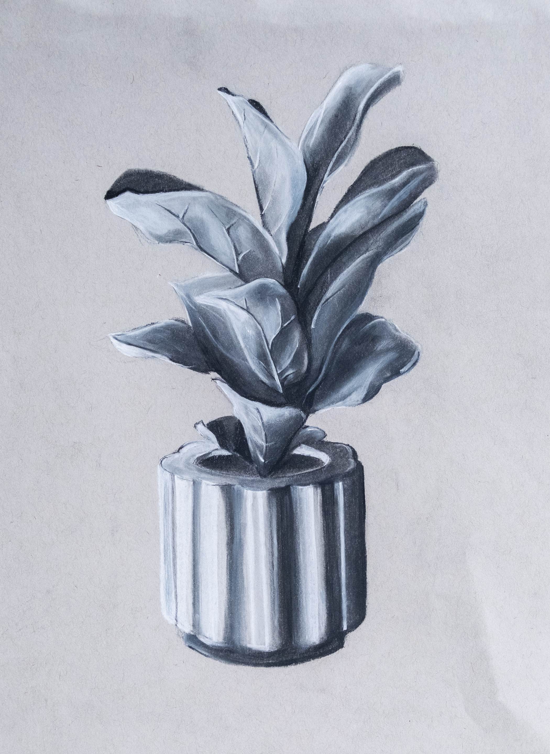 A flower pot made with white and black charcoal, illustrating a high contrast in colors.