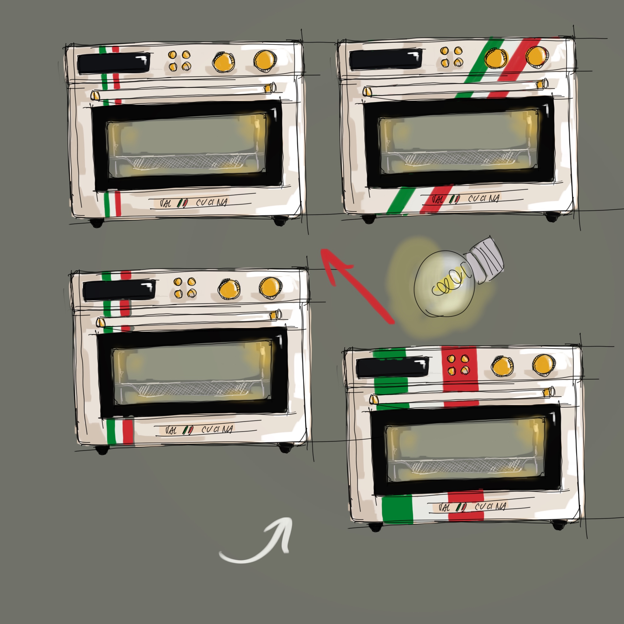 These are my designs for the Val Cucine conventional oven. This is concept art for an italian color scheme with the theme of Italian food.