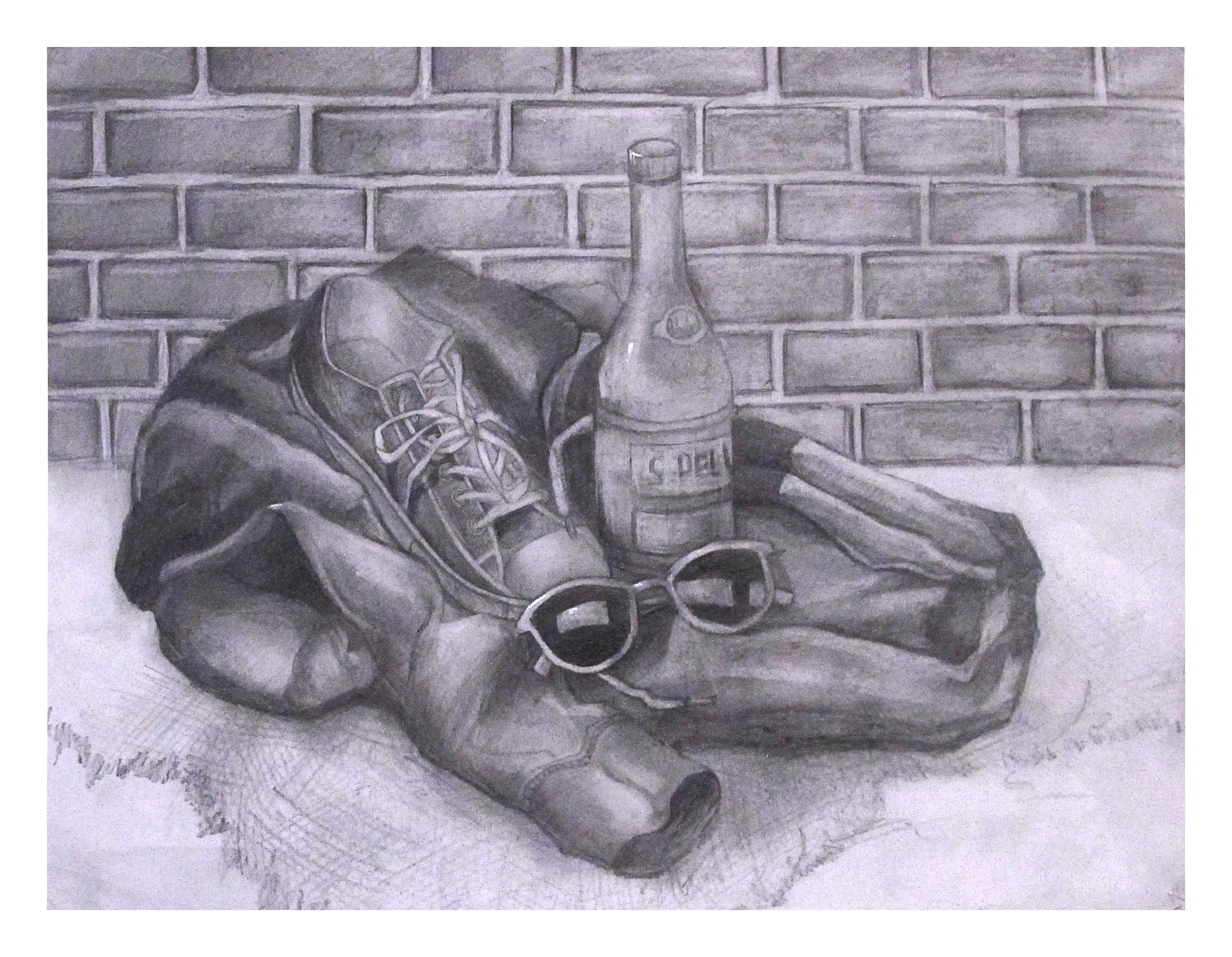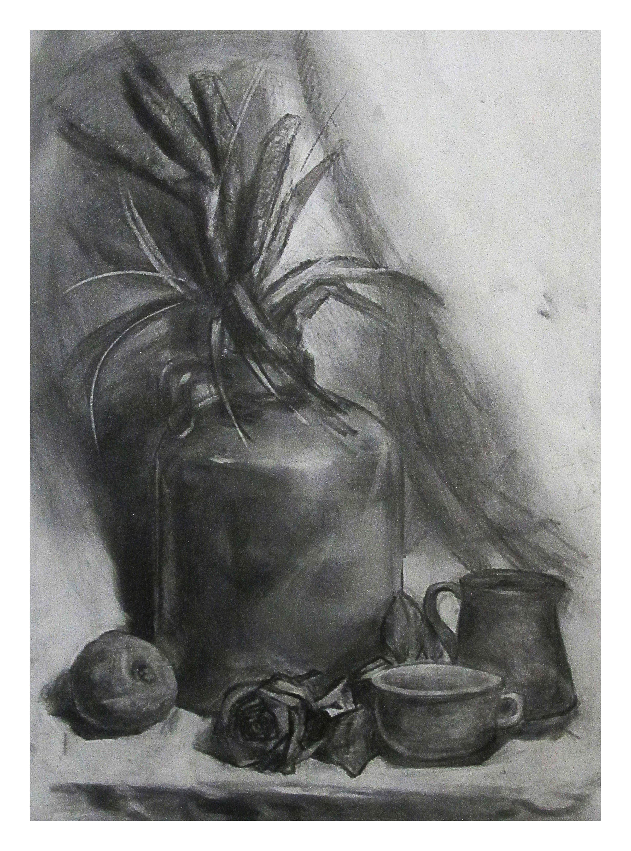 Pot, cups, rose, and fruit (Pencil and graphite powder)