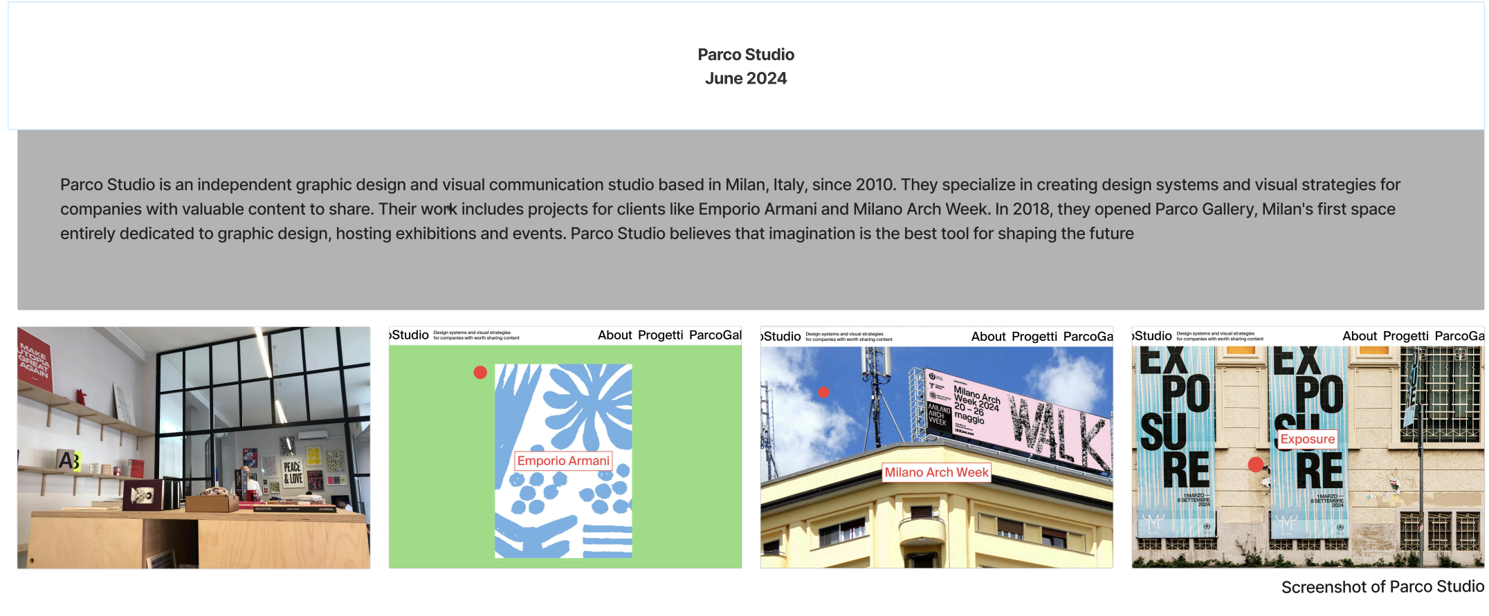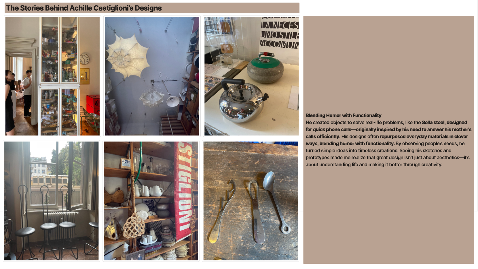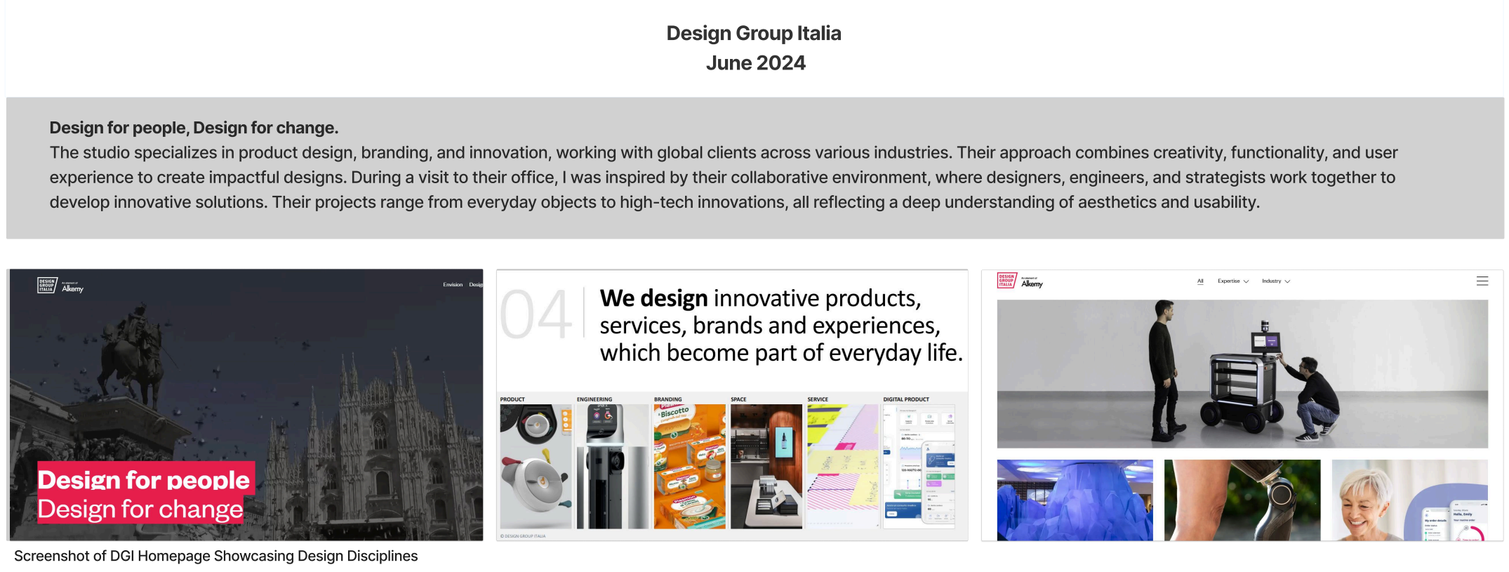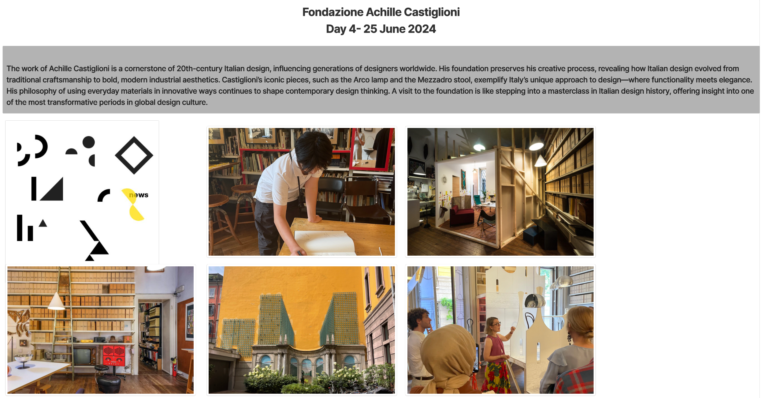 Design studios visited during my time in Italy.¶ Triennale Milano¶ Fondazione Achille Castiglioni¶ Mario Trimarchi Design¶ Parco Studio¶ ATTO¶ Frog¶ Design Group Italia¶