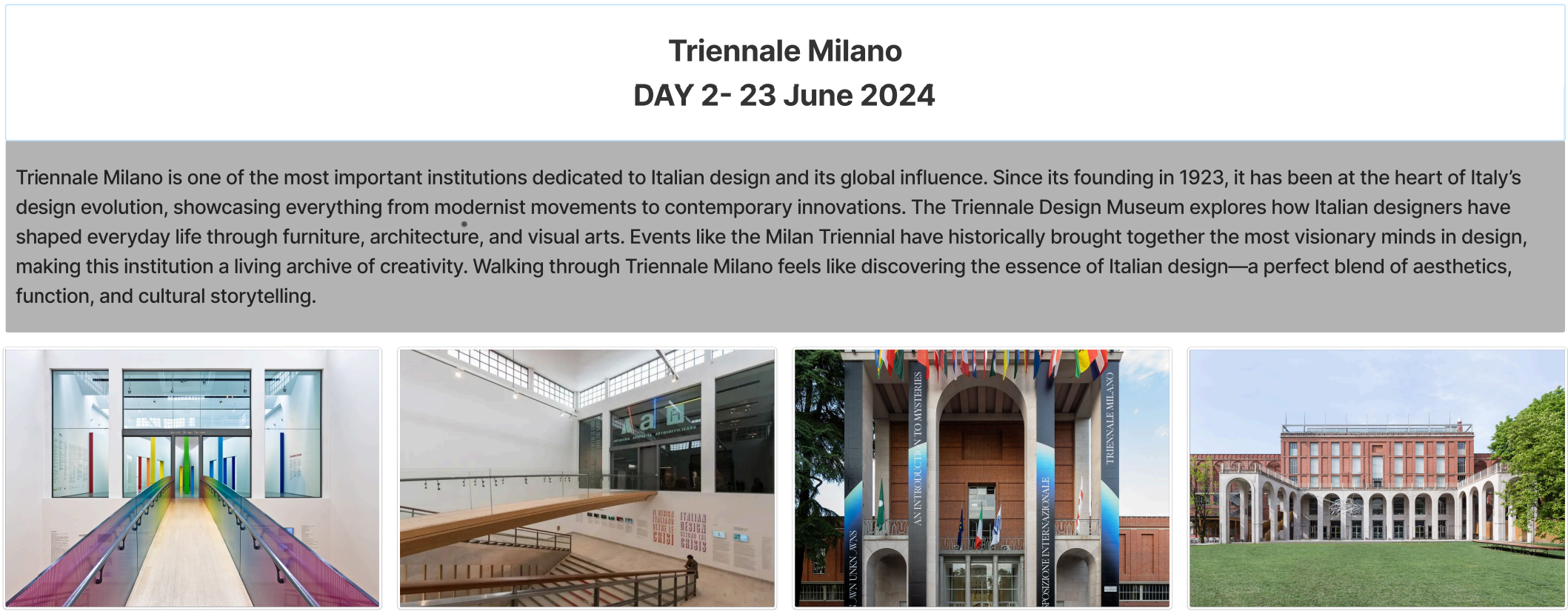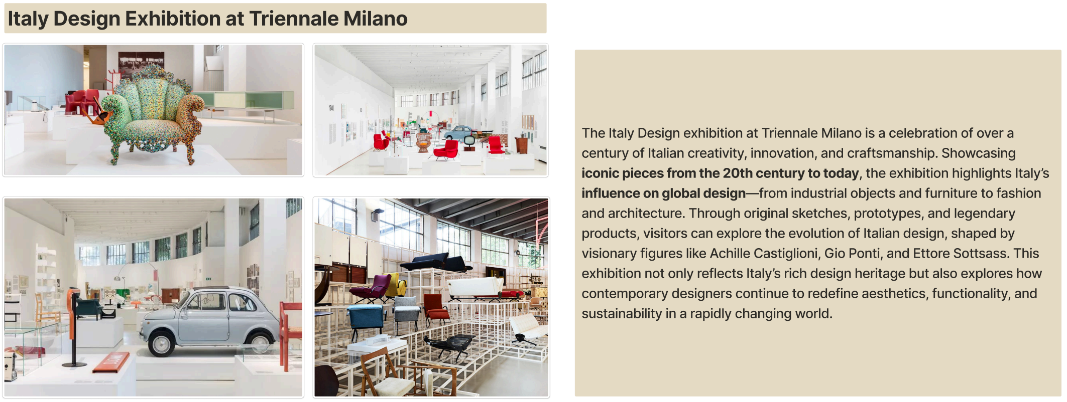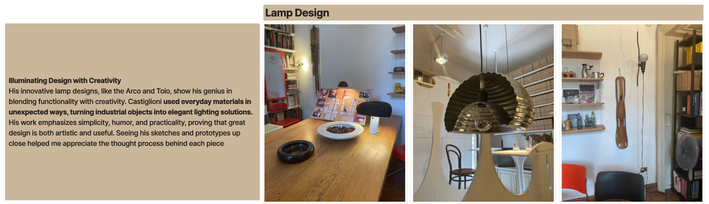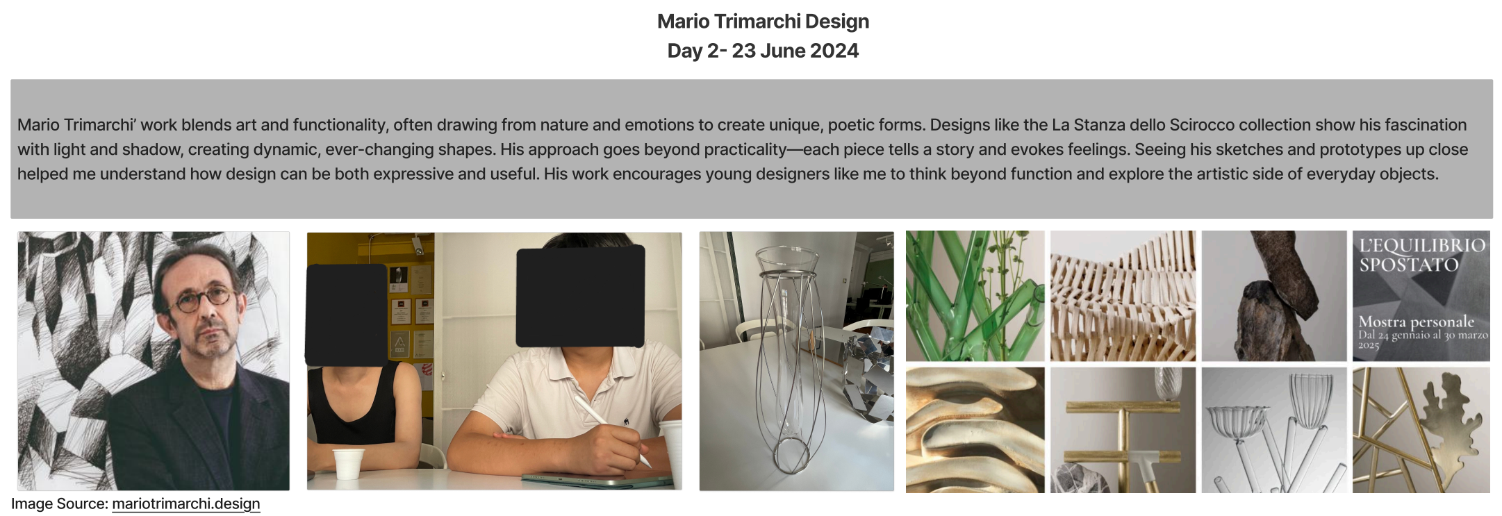 Design studios visited during my time in Italy.¶ Triennale Milano¶ Fondazione Achille Castiglioni¶ Mario Trimarchi Design¶ Parco Studio¶ ATTO¶ Frog¶ Design Group Italia¶