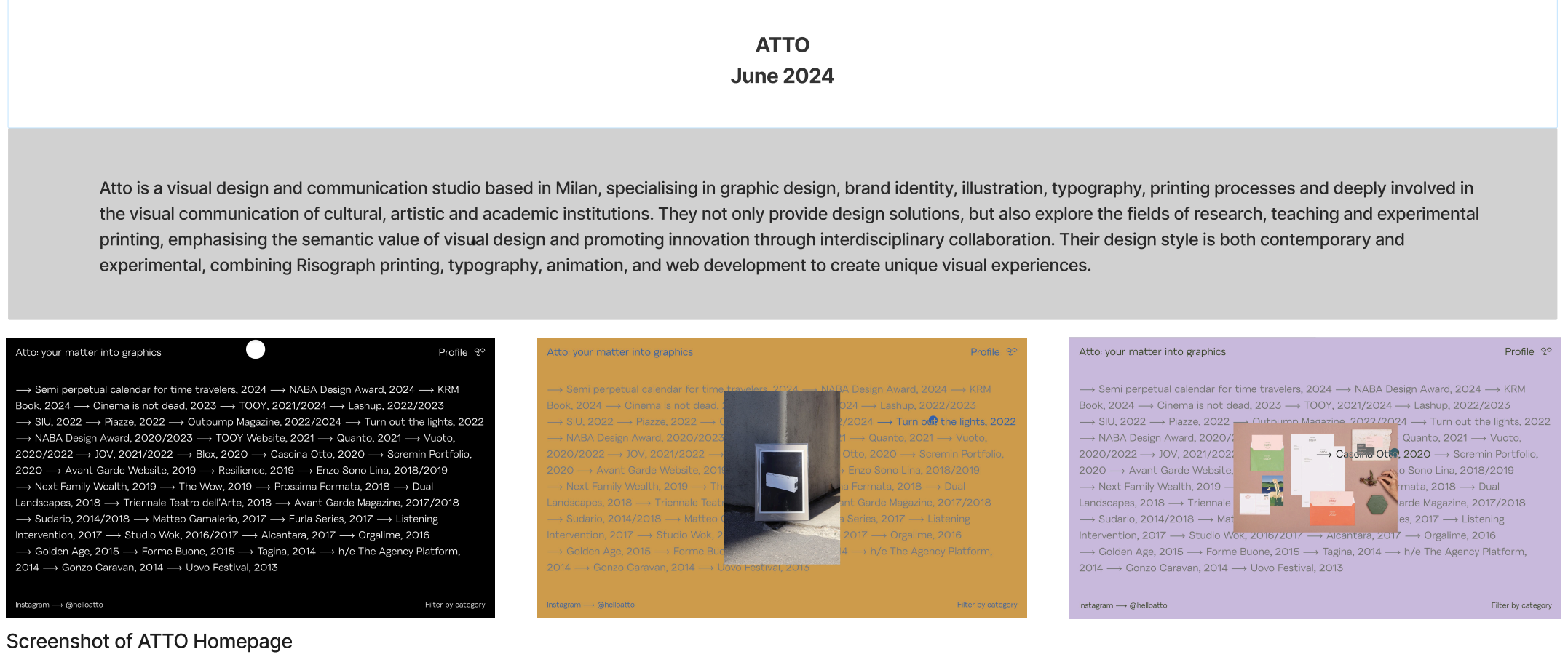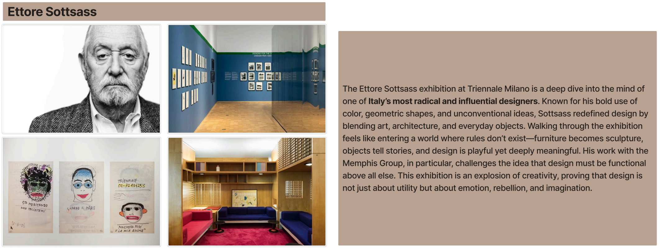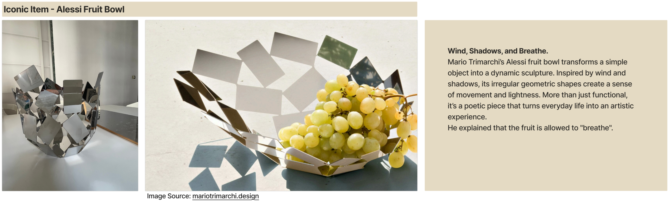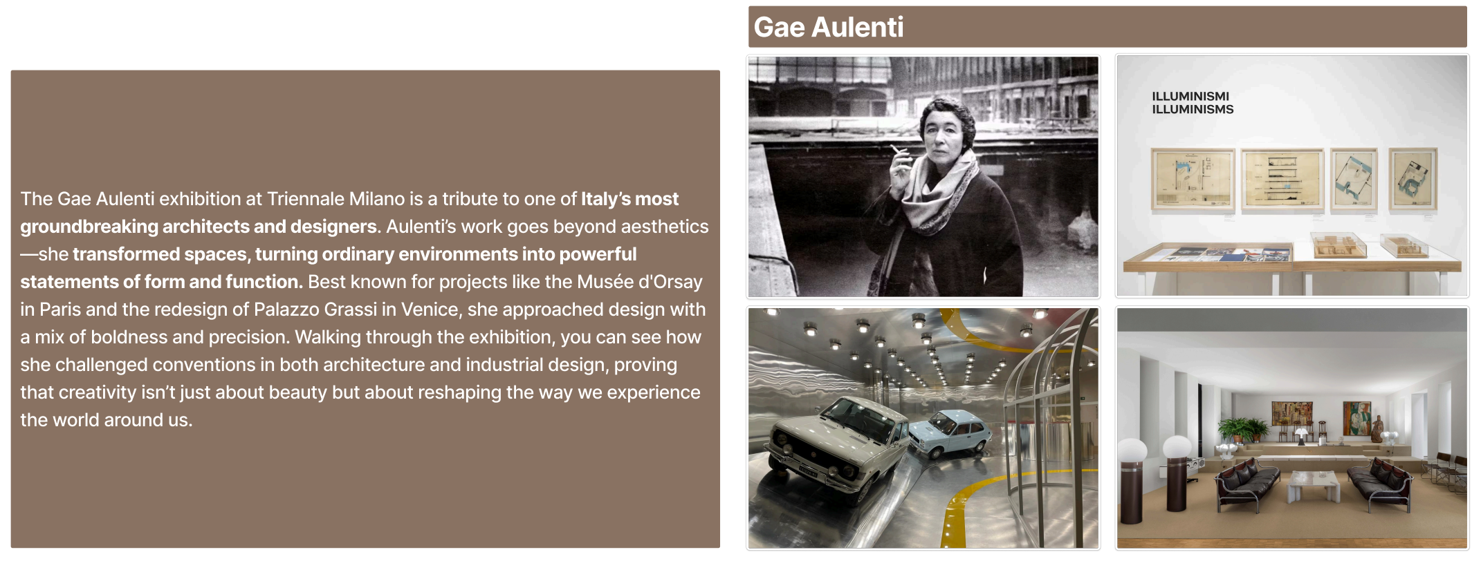 Design studios visited during my time in Italy.¶ Triennale Milano¶ Fondazione Achille Castiglioni¶ Mario Trimarchi Design¶ Parco Studio¶ ATTO¶ Frog¶ Design Group Italia¶