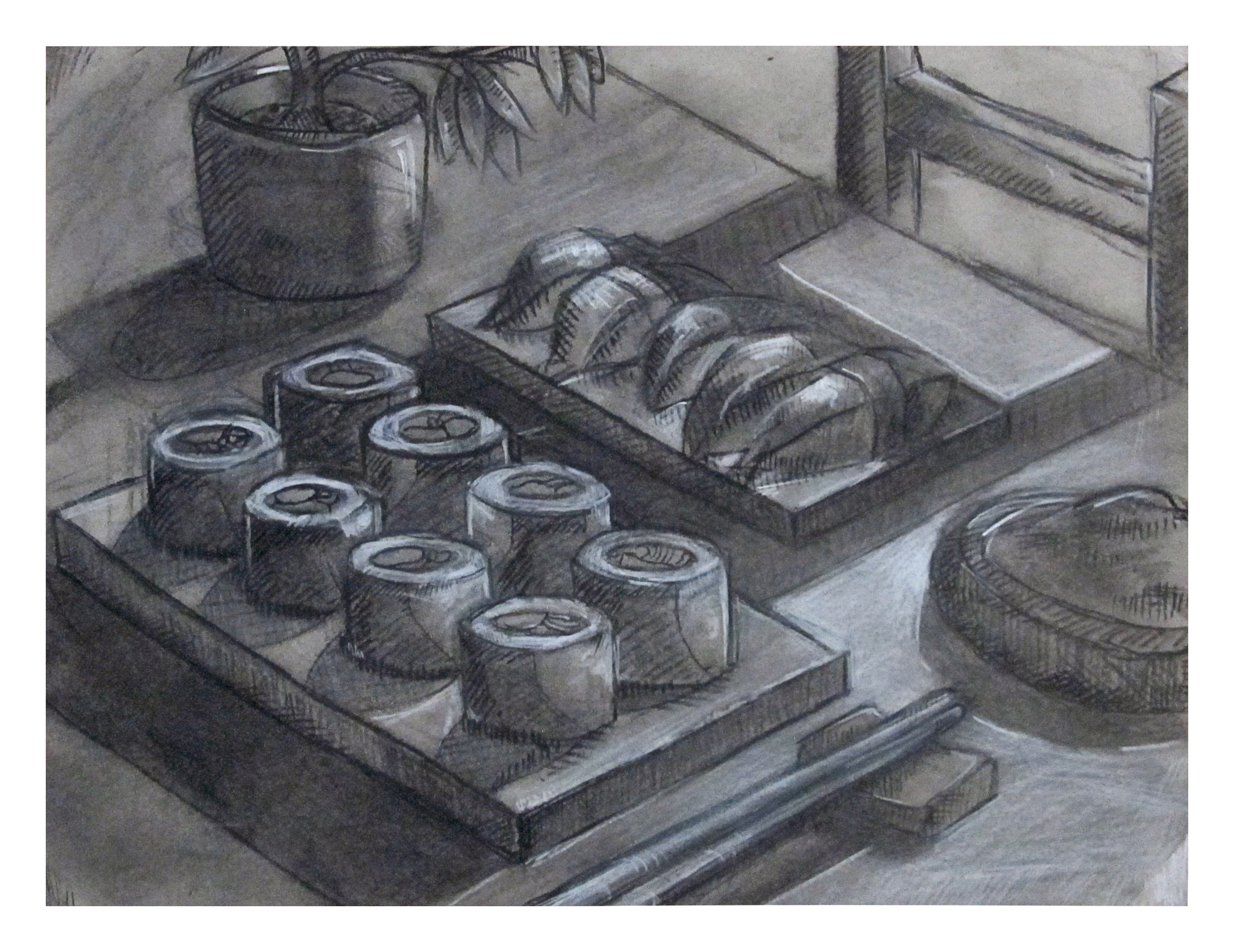 Pot, cups, rose, and fruit (Pencil and graphite powder)